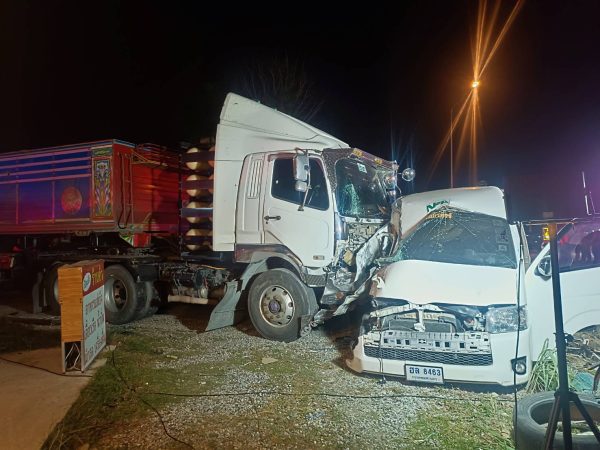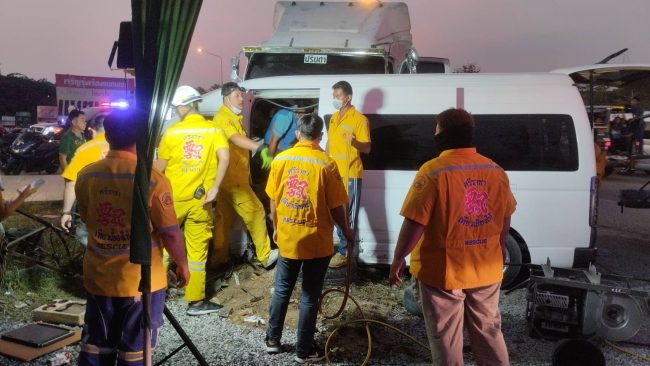 รถพ่วง18ล้อหักหลบรถเก๋งเสียหลักพุ่งชนรถตู้รับส่งพนักงานโรงงานบาดเจ็บ 3 ราย ติดภายในรถ1รายอาการสาหัส