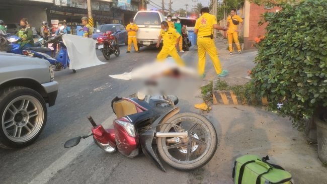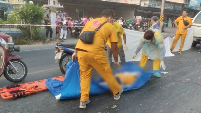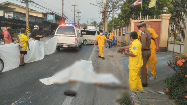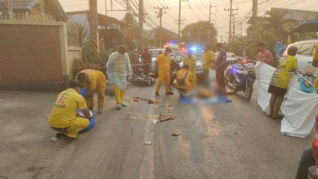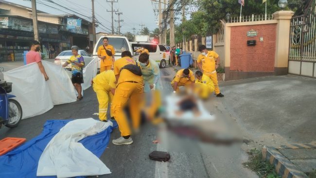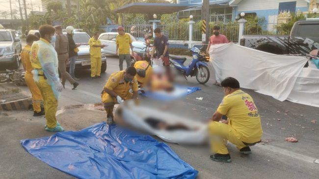 เมื่อเวลา16.50น.(7มี.ค.2566)ร้อยตำรวจเอกราชัน ไชยพิณ รองสารวัตรเวรสอบสวน สภ.หนองขาม ได้รับแจ้งมีรถพ่วง 22ล้อเหยียบ 2 สามีภรรยาชาวเมียนมาเสียชีวิตทั้งคู่ที่ถนนสุขาภิบาล 8 ขาเข้าตลาดบึงวรกิจช่วงใกล้เคียงกับร้านสกลรถสวย หมู่8 ตำบลบึง อำเภอศรีราชา หลังรับแจ้งจึงประสานอาสาหน่วยกู้ภัยเพียวเยี้ยงไท้ศรีราชา ออกไปร่วมตรวจสอบที่เกิดเหตุ โดยในที่เกิดเหตุพบรถจักรยานยนต์ยี่ห้อฮอนด้าเวฟ125 สีดำ-แดง หมายเลขทะเบียน2กย-7232 ชลบุรี ล้มคว่ำอยู่สภาพเสียหายเล็กน้อย