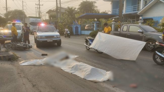 พ่วงตัวหางที่ขับมาหลบรถจักรยานยนต์ ที่ 2 ผัวเมียขี่มาแล้วรถล้มลงไม่พ้น จึงเหยียบเข้าที่ศีรษะของทั้งคู่จนกะโหลกแตก สมองไหลออกมากองกับพื้นถนนดังกล่าว จนทำให้ทั้งคู่เสียชีวิตคาที่เป็นที่น่าสยดสยองแก่ผู้ที่พบเห็น ซึ่งก็ขอรับผิดชอบในเหตุการณ์ที่เกิดขึ้น ซึ่งหลังจากนั้นทางตำรวจได้ให้หน่วยกู้ภัยเพียวเยี้ยงไท้ศรีราชา นำศพของ 2 ผัวเมียไปส่งที่โรงพยาบาลแหลมฉบังเพื่อรอญาติมารับศพไปบำเพ็ญกุศลต่อไป ส่วนคนขับรถพ่วง 22 ล้อนำไปสอบสวนต่อที่สถานีตำรวจภูธรหนองขามอีกครั้ง