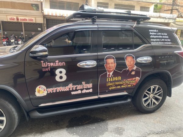 เสรีรวมไทยเขต 2 ชลบุรี ขอคะแนนเสียงพ่อค้าแม่ค้าตลาดใหม่ชลบุรี พร้อมติดป้าย “ผู้การเสรี”ทั่วชลบุรี