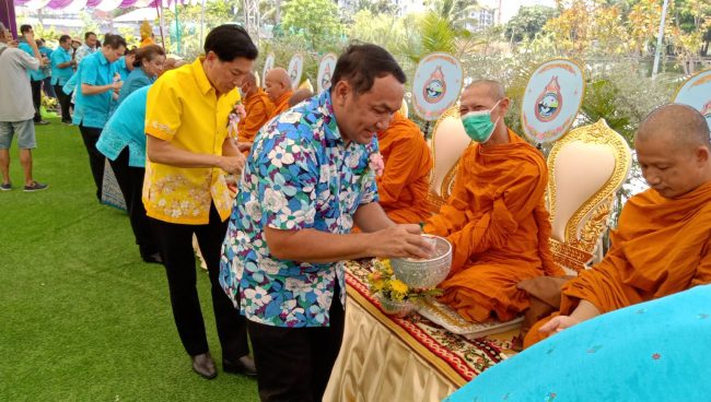 นครแหลมฉบัง จัดพิธีทำบุญเลี้ยงพระสงฆ์ และรดน้ำดำหัวขอพรจากผู้สูงอายุ เนื่องในวันสงกรานต์ เพื่อสืบสานวัฒนธรรมอันดีงามของคนไทย