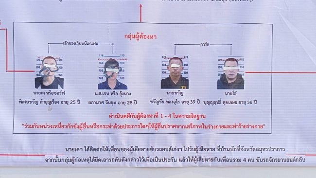 ต่อมาพนักงานสอบสวนได้สอบปากคําผู้เสียหาย พยาน และรายงานผู้บังคับบัญชาทราบ พ.ต.อ.เกริกศิษฐ์ เนียมนัดฐ์ ผกก.สภ.หนองขาม จึงได้ประสานการปฏิบัติกับ ผกก.สภ.เมือง สมุทรปราการ ลงพื้นที่สืบสวนขยายผลจนทราบว่า กลุ่มผู้ก่อเหตุประกอบด้วย 1.นายพิเศษ ขวัญ คําบุญเรือง 2.นายบุญญฤทธิ์ สุขเกษม 3.นายขวัญชัย ทองอุไร 4.น.ส.ผกามาศ จีนชุม จึงได้รวบรวมพยานหลักฐาน ขออนุมัติศาลออกหมายจับกลุ่มผู้ก่อเหตุดังกล่าว