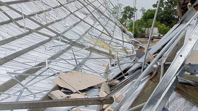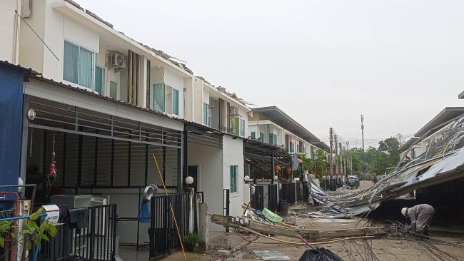 สภาพความเสียหายพายุถล่มหมู่บ้านจัดสรรแห่งหนึ่งในอำเภอศรีราชา พัดบ้านเรือนเสียหายกว่า 14 หลังหลังคาปลิว
