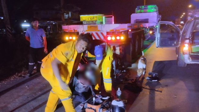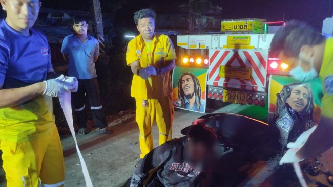 ง ส่วนพ่วง70-2112 ตรัง ที่โดนนรถจยย.ชนจนกรอบเหล็กไฟท้ายรถยุบลงไป ทางอาสาหน่วยกู้ภัยพยายามช่วยนำตัวออกจากขาที่คล่อมรถจยย.อยู่ เพื่อจะปฐมพยาบาลทำบาดแผล ที่หน้าผากมีบาดแผลขนาดใหญ่และใบหน้า แต่ผู้บาดเจ็บซึ่งอยู่ในอาการเมาสุราอย่างหนัก พยายามดิ้นรนต่อสู้ ไม่ให้ทางอาสากู้ภัยเข้าช่วยเหลือ ซึ่งทางอาสากู้ภัยพยายามช่วยกันจับตัวไว้จนทำบาดแผลสำเร็จ แล้วรีบนำตัวส่งโรงพยาบาลแหลมฉบังให้แพทย์ทำการรักษาอาการบาดเจ็บต่อไป