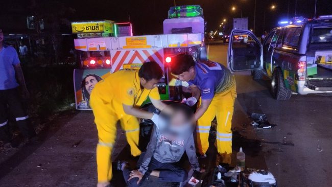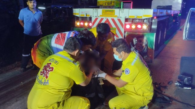 หนุ่มใหญ่เมาซิ่งรถจยย.ชนท้ายรถพ่วง 22 ล้อที่จอดอยู่ริมถนนอาการสาหัส