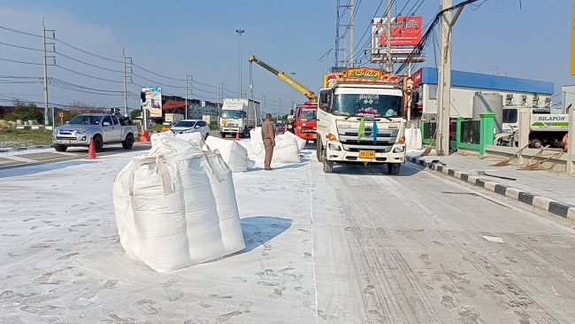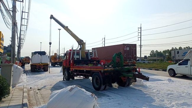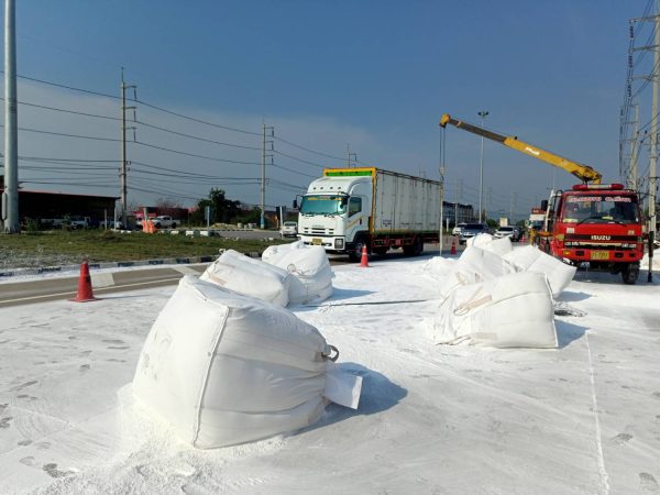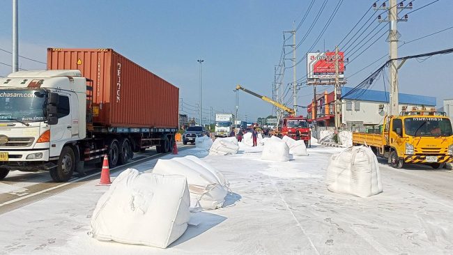 เมื่อเวลา16.30น. วันที่15 พฤษภาคม พ.ศ.2566 พ.ต.ต เศรษฐพล สิงห์นอก สารวัตรเวรสอบสวน สภ.หนองขาม อ.ศรีราชา จ.ชลบุรี รับแจ้งมีอุบัติเหตุรถบรรทุกพ่วง10ทำถุงบิ๊กแบ๊กที่บรรจุแป้งมันสำปะหลังมา23ถุงหล่นกลางถนนทำให้มีการจราจรติดขัดยาวหลายกิโลเหตุเกิดบริเวณยูเทิร์นนิคมปิ่นทอง1 ถ.มาบเอียง ขาเข้าแหลมฉบัง ม.1 ต.หนองขาม อ.ศรีราชา จ.ชลบุรี และได้ประสานงานไปที่หน่วยป้องกันและบรรเทาสาธารณภัยเทศบาลนครเจ้าพระยาสุรศักดิ์ เพื่อขอกำลังเจ้าหน้าที่และรถดับเพลิงสนับสนุนในที่เกิดเหตุก่อนจะรีบรุดเดินทางไปตรวจสอบสถานที่เกิดเหตุ