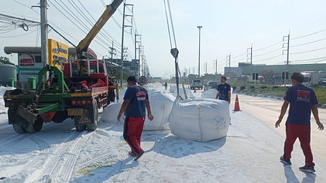 เทกระจาดแป้งขาวโพนกลางถนนหลวงรถพ่วง10ล้อขนแป้งมันสำปะหลังมาเต็มคันรถคนขับพยามเปลี่ยนเลนกะทันหันแต่รถเกิดเสียหลักเทกระจาดถุงมันสำปะหลังหล่นเกลื่อนถนนเจ้าหน้าที่เร่งเก็บกู้การจราจรติดขัดยาวหลายกิโล