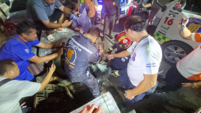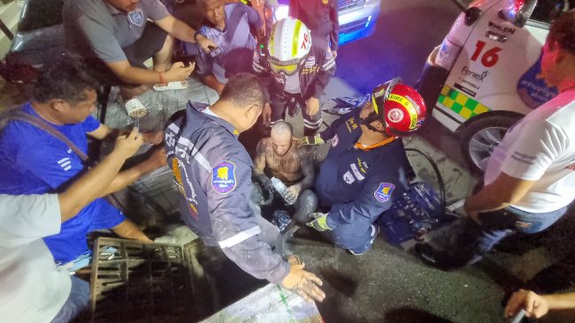 ที่เกิดเหตุพบชาวบ้านจำนวนมากมุงดูเหตุการณ์ พบ นักท่องเที่ยวชาวอเมริกัน ติดอยู่ในท่อระบายน้ำ กว้างประมาณ 60 เซ็นติเมตร ลึกประมาณ 1.5 เมตร รอความช่วยเหลือ เจ้าหน้าที่กู้ภัยฯ พลเมืองดี ใช้อุปกรณ์งัดท่อก่อนช่วยกันดึงตัวชาวต่างขึ้นมาได้ อยู่ในสภาพเนื้อตัวมอมแมม อาการอิดโรย เจ้าหน้าที่กู้ภัยฯ ปฐมพยาบาลเบื้องต้น