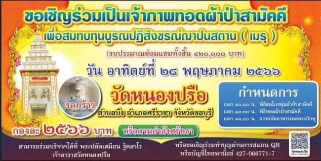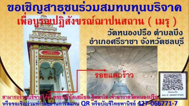 วัดหนองปรือ ตำบลบึง บอกบุญผู้มิจิตศรัทธาร่วมเป็นเจ้าภาพทอดผ้าป่าสามัคคี บูรณะซ่อมแซมเมรุเผาศพที่ชำรุด