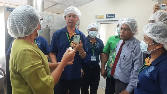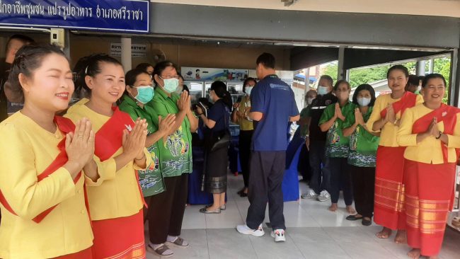 เมื่อเวลา15.00น.ของวันที่31พ.ค.ที่กลุ่มวิสาหกิจชุมชนแม่บ้านเกตรกรเนินบก ม.5 ต.บ่อวิน อ.ศรีราชา จ.ชลบุรี ให้การต้อนรับคณะศึกษาดูงานจากสถาบันโภชนาการ มหาวิทยาลัยมหิดล และ ผู้ทำงานด้านอาหารและโภชนาการจาก สปป.ลาว โดยมี นายบรรจง แก้วมณี ผู้ใหญ่บ้าน ม.5 และนางสัมฤทธิ์ ทองวิเชียร ประธานกลุ่มวิสาหกิจชุมชนพร้อมคณะกรรมการ สมาชิกให้การต้อนรับคณะจากสถาบันโภชนาการมหาวิทยาลัยมหิดล และ ผู้ทำงานด้านอาหารและโภชนาการ จาก สปป. ลาว รวม 40 คน เดินทางมาศึกษาดูงาน ในจังหวัดชลบุรี