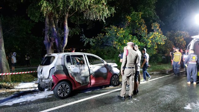 เมื่อเวลา 19.30 น.วันที่ 5 มิถุนายน 2566 ร.ต.อ.องอาจ ทุมสุด รอง สว.สอบสวน สภ.หนองปรือ รับแจ้งเหตุเพลิงไหม้รถยนต์ มีคนติดอยู่ในยานพาหนะ เหตุเกิดริมถนนขอบอ่างมาบประชัน ม.4 ต.หนองปรือ อ.บางละมุง จ.ชลบุรี หลังรับแจ้งจึงพร้อมด้วยกำลังเจ้าหน้าที่บรรเทาสาธารณภัยเทศบาลหนองปรือ เจ้าหน้าที่กู้ภัยสว่างบริบูรณ์ธรรมสถานเมืองพัทยา รีบนำกำลังไปตรวจสอบ
