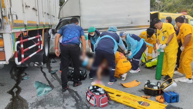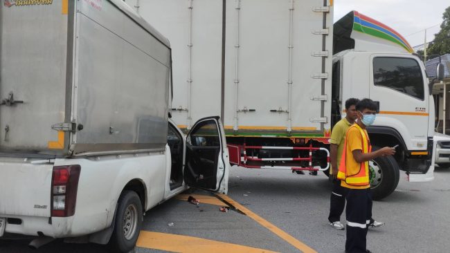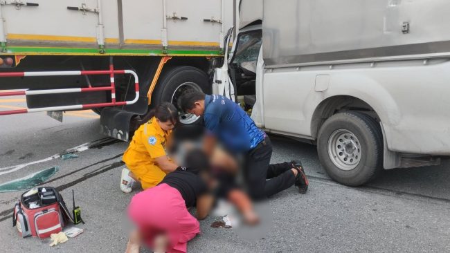 รถบรรทุกหกล้อตู้ทึบเลี้ยวกลับรถบนเนินถูกรถกระบะตู้ทึบพุ่งชนทำให้ผู้โดยสารในรถกระบะบาดเจ็บสาหัส