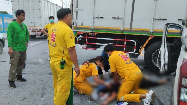 ทางอาสาหน่วยกู้ภัยเพียวเยี้ยงไท้ศรีราชา กำลังช่วยเหลือปฐมพยาบาลด้วยการปั๊มหัวใจเพื่อรอรถฉุกเฉินลั่นทม โรงพยาบาลสมเด็จพระบรมราชเทวี ณ ศรีราชา มารับตัวผู้บาดเจ็บสาหัส ซึ่งทางอาสาหน่วยกู้ภัยเพียวเยี้ยงไท้ศรีราชาผลัดกันปั๊มหัวใจนานกว่า 30 นาที จนรถพยาบาลฉุกเฉินลั่นทมพร้อมทีมแพทย์และพยาบาล โรงพยาบาลสมเด็จพระบรมราชเทวี ณ ศรีราชา เดินทางมาถึงเพื่อรับตัวผู้บาดเจ็บสาหัส ส่งโรงพยาบาลสมเด็จพระบรมราชเทวี ณ ศรีราชา ให้แพทย์ทำการรักษาอาการต่อไป