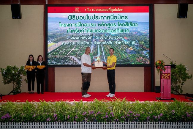 วันนี้ นายกัมพล ตันสจจา ประธานสวนนงนุชพัทยา และ ผู้แทนท่านผู้บัญชาการทหารบก พลโท นิรันดร ศรีคชา รองเสนาธิการทหารบก ได้จัดพิธีมอบใบประกาศนียบัตรให้กับกำลังพลของกองทัพบกที่เข้าฝึกอบรมจบหลักสูตรดังกล่าว จำนวน 22 นาย จากการฝึกอบรมนำไปใช้ประกอบอาชีพให้กับตนเอง และครอบครัวสามารถนำความรู้ที่ได้มาประยุกต์และเผยแพร่ในองค์กรและต่อยอดในด้านการเกษตรทฤษฎีใหม่ให้กับทหารกอง ประจำการที่กำลังจะปลดประจำการในรุ่นต่อไป