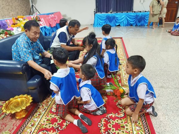 โดยเด็กนักเรียนได้คุกเข่า พร้อมถือพานพุ่มดอกไม้ พวงมาลัย มอบให้กับ นายกฯวินัย คุ้มครอง ประธานพิธี และ ปลัดฯสุขสันต์ นูพิมพ์ ทางนายกฯวินัย คุ้มครอง ประธานพิธีและปลัดฯ สุขสันต์ นูพิมพ์ ได้มอบเงินให้กับเด็กนักเรียนทุกคน และทางนายกฯวินัย คุ้มครอง ได้ทำการเจิมหนังสือเรียนประจำปีการศึกษา 2566 ภาคเรียนใหม่ ให้อีกด้วย พร้อมกับได้กล่าวในงานว่า วันนี้ผมมีความรู้สึกยินดีที่ได้มาเป็นประธานพิธีไหว้ครู ประจำปี 2566 ขอให้เด็กนักเรียนทุกคนได้มีความตั้งใจเรียน เพื่อที่จะได้มีอนาคตที่ดีของตัวเองต่อไป และ ขอให้เป็นลูกที่ดีของพ่อแม่ ผู้ปกครอง เป็นลูกศิษย์ที่ดีของคุณครู ผมขอให้คุณครูทุกท่านได้ช่วยอบรมสั่งสอนและดูแลเด็กทุกคนในศูนย์พัฒนาเด็กเล็กฯของตำบลบ้านเก่า ให้เป็นไปด้วยดีด้วยครับ