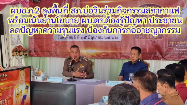 เมื่อเวลา 08.00 น.วันที่ 15 มิถุนายน พล.ต.ท.อิทธิพล อิทธิสารรณชัย ผบช.ภ.2 เป็นประธานในกิจกรรมสภากาแฟ พบปะ กต.ตร.สภ.บ่อวิน, ภาคประชาชน, ส่วนราชการ ในพื้นที่ สภ.บ่อวิน โดยได้รับประทานอาหารเช้าร่วมกัน พร้อมพูดคุย หารือถึงแนวทางสร้างชุมชนเข้มแข็ง อย่างยั่งยืน เช่น โครงการชุมชนยั่งยืนแก้ไขปัญหายาเสพติด, ด่านชุมชน, ตำรวจชุมชน, สมาชิกแจ้งข่าวอาชญากรรม และ กล้อง CCTV 4.0 เป็นต้น ตลอดจนรับฟังสภาพปัญหาของชุมชน ส่วนราชการในพื้นที่ เพื่อหารือแนวทางแก้ไขปัญหาร่วมกันอย่างยั่งยืน
