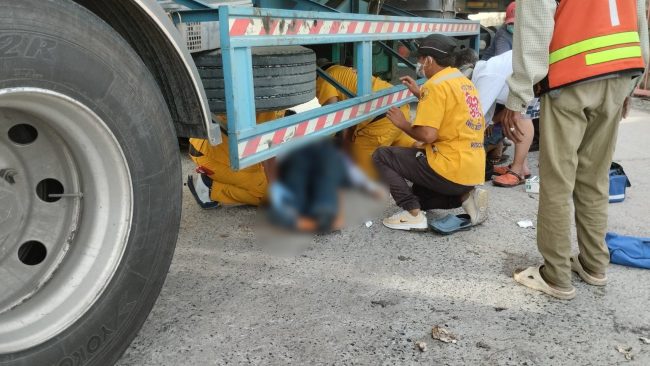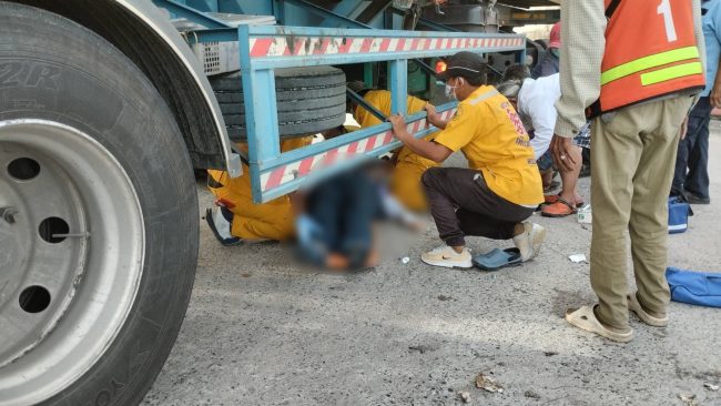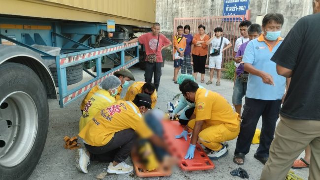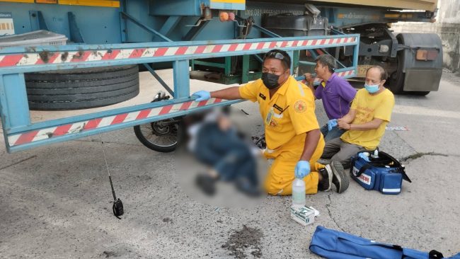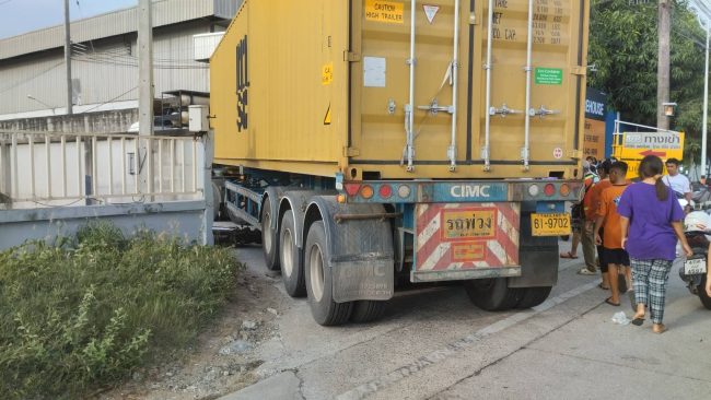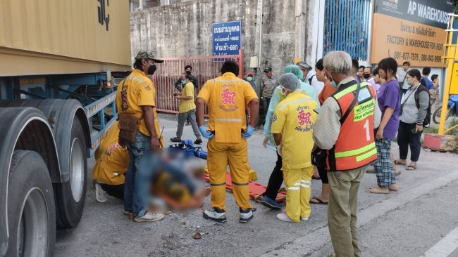สาวใหญ่ขี่รถจยย.ตามรถพ่วง18ล้อมารถพ่วงเลี้ยวเข้าซอยลานตู้กะทันหันทำให้เบรกรถจยย.เสียหลักพุ่งเข้าไปใต้ท้องรถ18ล้อหวิดโดนเหยียบตาย