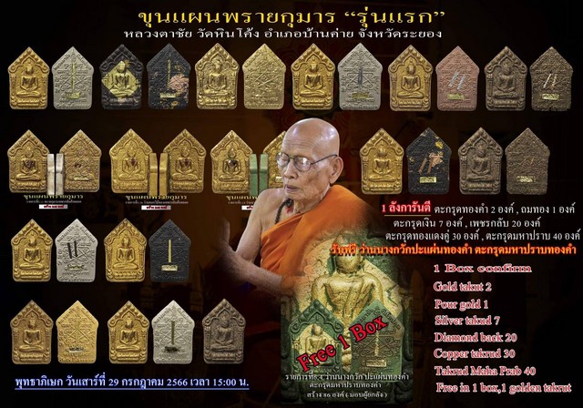 พระขุนแผน ลุ้นละ 149 บ. 1ลัง( 100องค์ ) ต้องมี พรายกุมารบรอนซ์ทอง ตะกรุดมหาปราบทองคำ 1 องค์ ก้นครกปะแผ่นทองคำ ตะกรุดมหาปราบทองคำ 1 องค์ พรายกุมารถมทองคำแท้เต็มองค์ 1 องค์ คละชุดตะกรุดเงิน การันตีตะกรุดเงินคู่ 7 องค์ คละชุดรายการเพชรกลับ การันตีเพชรกลับในลัง 20 องค์ คละชุดตะกรุดทองแดงคู่ การันตีในลัง 30 องค์ คละชุดตะกรุดมหาปราบ การันตีในลัง 40 องค์