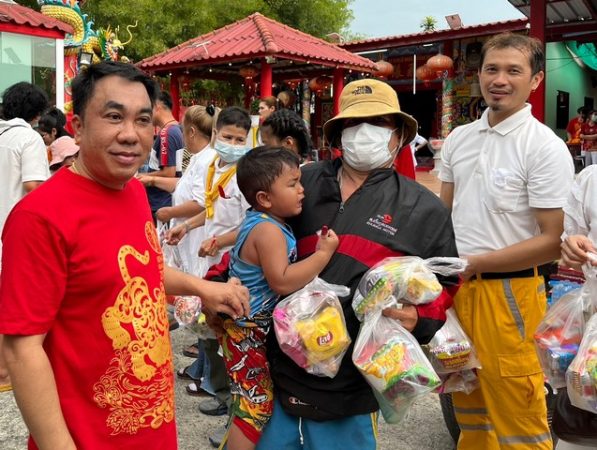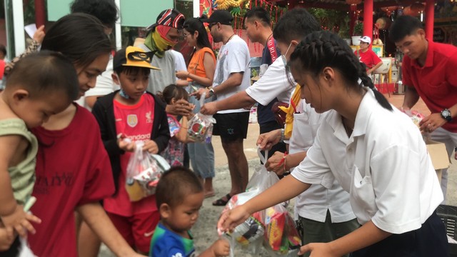 ข้าวสารพุ่งชาวบ้านกว่า 1,000 คน ทะลักรอรับ ข้าวสาร อาหารแห้งในประเพณีทิ้งกระจาด แจกทาน ประจำปีศาลเจ้าพ่อเตียวหุย ขอบอ่างบางพระ วันรำลึกวันร่วมน้ำสาบาน