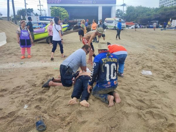ที่เกิดเหตุพบประชาชนมามุงดูเหตุการณ์จำนวนมาก บนพื้นทรายท่าขึ้นเรือหาดจอมเทียนพบร่าง นายมานิตย์ ใจมั่น อายุ 73 ปี นอนได้รับการปฐมพยาบาลเบื้องต้น ปั้มหัวใจเพื่อยื้อชีวิตก่อนจะสิ้นใจเสียชีวิตในเวลาต่อมา โดยมีกลุ่มญาติและเพื่อนร่วมงาน ร้องไห้ด้วยความเศร้าโศกเสียใจ ตรวจสอบยังพบรถไถ ขนาด 6,600 แรงม้า สองคันจอดอยู่ภายในน้ำทะเล และเรือสปีดโบ๊ทลอยลำอยู่ โดยรถไถหนึ่งคันได้รับความเสียหาย ท่อไอเสียหักคดงอ ตัวฝากครอบเครื่องยนต์บิดเบี้ยวได้รับควาตมเสียหาย โครงหลังคาหลุดหักอยู่ในน้ำ