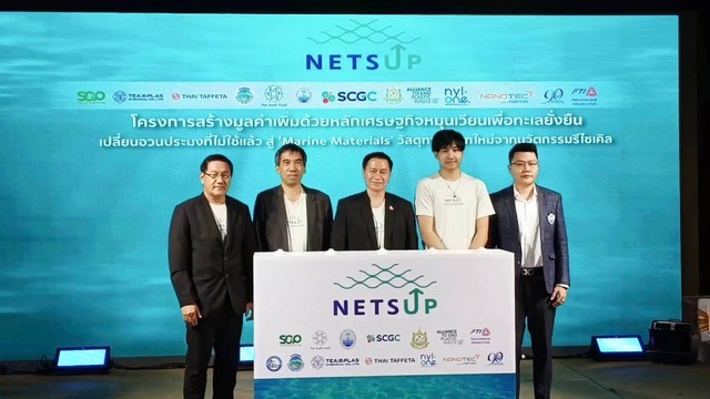 ดร.สุรชา อุดมศักดิ์ ประธานเจ้าหน้าที่สายงานนวัตกรรม และรองกรรมการผู้จัดการใหญ่ บริษัท เอสซีจี เคมิคอลส์ จำกัด (มหาชน) หรือ SCGC กล่าวว่า โมเดล “Nets Up” ได้เชื่อมโยงโซ่คุณค่า (Value Chain) อย่างครบวงจร โดยเริ่มต้นที่การจัดการอวนประมงที่ไม่ใช้แล้ว และนำเข้าระบบการซื้อขายของธนาคารขยะชุมชน ผ่านแอปพลิเคชั่น “คุ้มค่า”จากนั้นจึงเข้าสู่กระบวนการรีไชเคิลเป็นเม็ดพลาสติกรีไซเคิลคุณภาพสูง และพัฒนาเป็น Marine Materials วัสดุรีไซเคิลจากอวนประมงไม่ใช้แล้ว เช่น วัสดุผ้าในธุรกิจสิ่งทอ บรรจุภัณฑ์ อุปกรณ์รองเท้ากีฬา ชิ้นส่วนยานยนต์ อุปกรณ์ไฟฟ้า เป็นต้น