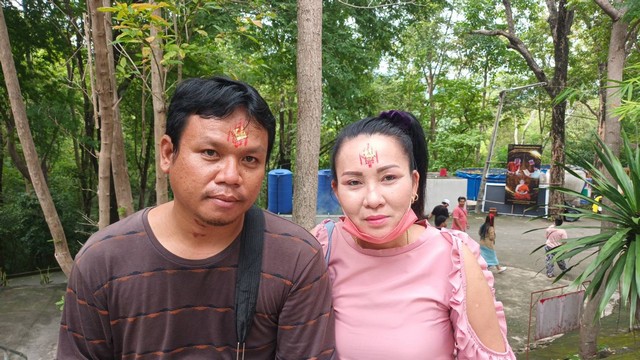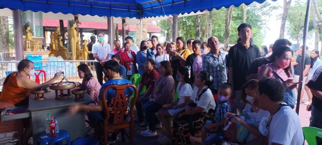 วันหยุดประชาชาชนนับพัน แห่เจิมหน้าพาก ลงอักขระ “พระพุทธพักตร์หน้าทอง” หวังทำมาค้าขาย เมตตา หลังทราบว่าวัดเขาไม้แดง นำยันต์ผ่านพิธีปลุกเสกจาก เกจิอาจารย์ดังหลายวาระนับพันรูป