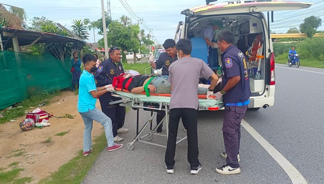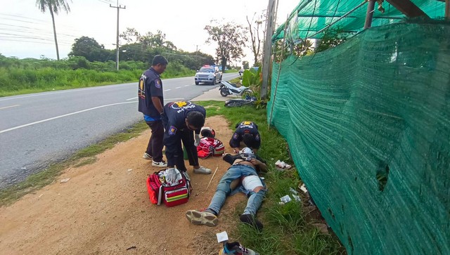 ชลบุรี-หนุ่มซิ่งจยย.เสียหลักชน เสาไฟฟ้าขาด 2 ท่อน นอนเจ็บสาหัส