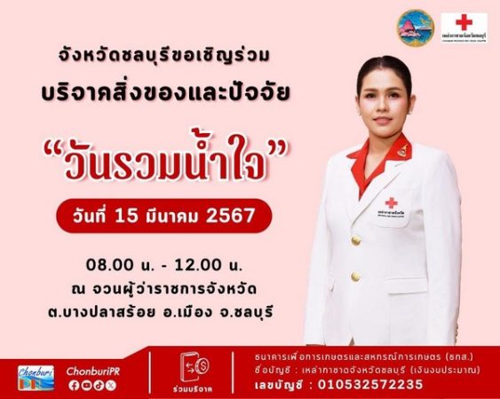 เมื่อวันที่ 8 มีนาคม นายธวัชชัย ศรีทอง ผู้ว่าราชการจังหวัดชลบุรี เปิดเผยว่า จังหวัดชลบุรี และเหล่ากาชาดจังหวัดชลบุรี ขอเชิญชวนภาครัฐ เอกชน และประชาชนร่วมบริจาคสิ่งของและปัจจัย ใน “วันรวมน้ำใจ” วันที่ 15 มีนาคม 2567 ตั้งแต่เวลา 08.00 น.-12.00 น. ณ จวนผู้ว่าราชการจังหวัดชลบุรี อ.เมือง จ.ชลบุรี