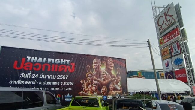 เมื่อเวลา 16.00 น. วันที่ 24 มีนาคม 2567 ผู้สื่อรายงานงานบรรยากาศก่อนมวย ‘ไทยไฟต์ ปลวกแดง’ ซึ่งจัดขึ้นบริเวณลานกิจกรรมศูนย์การค้าซีเค พลาซ่า ต.ปลวกแดง อ.ปลวกแดงจ.ระยอง จะเริ่มขึ้น โดยบริเวณหน้างานมีบรรดาพี่น้อง ปชช. เดินทางมารอเข้าชมมวยรายการดังกล่าวจำนวนมาก โดยต่อแถวเข้าคิวยาวเหยียดทยอยเข้าชม ท่ามกลางอากาศค่อนข้างร้อนอบอ้าว ซึ่งบริเวณหน้าทางเข้างานมีกิจกรรมหลากหลายให้ผู้ชมงานได้ร่วมสนุกจากผู้สนับสนุนมวย ‘ไทยไฟต์ ปลวกแดง’ ดังกล่าว เป็นการสร้างสีสันในงาน รวมทั้งมีการจำหน่ายเสื้อ ‘ไทยไฟต์ ปลวกแดง’ เพื่อเก็บไว้เป็นของที่ระลึกอีกด้วย