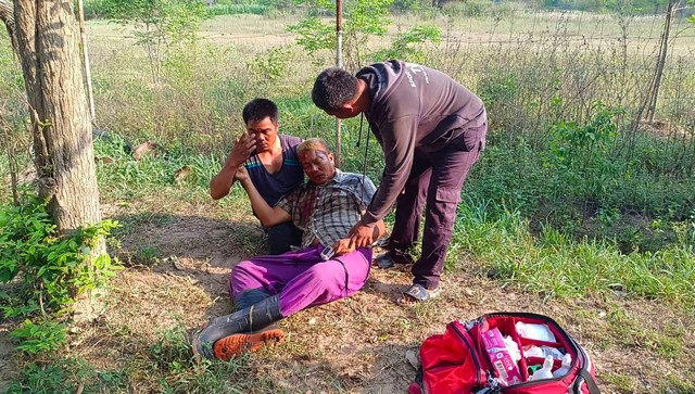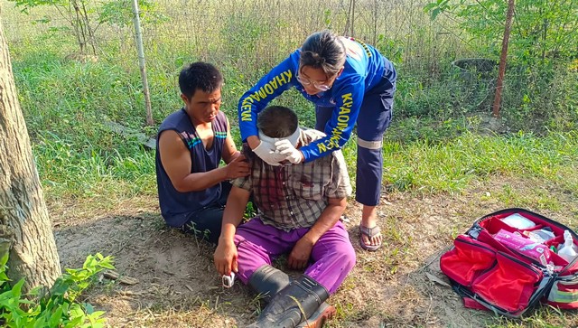 ที่เกิดเหตุพบนายสมัย เครือสวน อายุ 66 ปี เจ้าของวัว ได้รับบาดเจ็บที่ใบหน้าบริเวณบริเวณหน้าผาก อาการปวดบวมมีเลือดไหลอาบใบหน้า เจ้าหน้าที่กู้ภัยฯปฐมพยาบาลเบื้องต้น