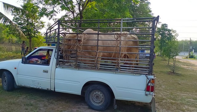 ก่อนเคลื่อนย้ายส่งโรงพยาบาลอย่างเร่งด่วน บริเวณลานจอดรถพบรถยนต์ติดตั้งใส่คอกสูงบรรทุกวัวเพศเมีย อายุราวสองปีเศษ