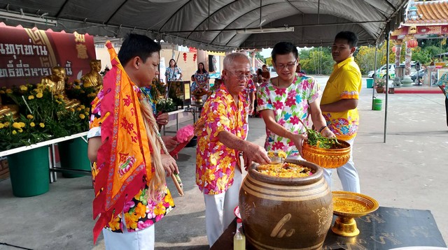 หลังจากนั้นคณะทรงจากพุทธสมาคมเพียวเยี้ยงไท้ศรีราชาก็ได้ทำพิธีอัญเชิญองค์เทวะอาจารย์องค์โป้ยเซียนโจวซือมาประทับทรงเพื่อให้สาธุชนสรงน้ำขอพรพร้อมทั้งประพรมน้ำมนต์เพื่อเป็นสิริมงคลในเทศกาลสงกรานต์หรือปีใหม่ไทย สำหรับผู้ที่มาร่วมงานในวันนี้ทุกคนต่างปลาบปลื้มใจที่ นายอำมาตย์ โสภณารมณ์ นายกพุทธสมาคมสัจจะธรรมสงเคราะห์พ้งไล้ซาจับซาเซียวเกาะ โรงเจบึงไร่ 1พร้อมด้วยคณะกรรมการบริหารฯที่จัดงานขึ้นมาเป็นประจำทุกปี