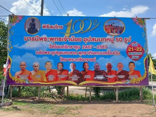 วัดโนนศัทธาชุมจัดงานยิ่งใหญ่อุปสมบทหมู่จำนวน 50 รูป เพื่อเฉลิมพระเกียรติพระบาทสมเด็จพระเจ้าอยู่หัว พร้อมสร้างพระอุปคุตมหาลาภ รุ่นเสือสั่งฟ้า รุ่นพระพุทธเจ้าน้อยบนเครื่องบิน รายได้นำไปต่อเติมและการก่อสร้างฐานองค์พระพุทธเจ้าน้อย