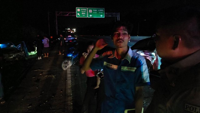 ที่เกิดเหตุกลางถนนพบรถยนต์กระบะ toyota vigo สีทอง หมายเลขทะเบียน ถส 3027 กรุงเทพมหานคร สภาพรถด้านหน้าพังยับเยิน มีนายชีวรรณ ราตะกั่ว อายุ 50 ปี เป็นคนขับขี่ ได้รับบาดเจ็บเล็กน้อย ใกล้กันยังพบรถยนต์เก๋ง mitsubishi lancer สีบรอนซ์ หมายเลขทะเบียน กล 9178 ลพบุรี สภาพรถพังยับเยิน มีนายวิมล นุมะลิจันทร์ อายุ 27 ปี เป็นคนขับ ได้รับบาดเจ็บเล็กน้อย ห่างออกไปยังพบรถยนต์กระบะ isuzu d-max หมายเลขทะเบียน ผน 3656 ระยอง ที่จอดอยู่ไหล่ทาง สภาพรถด้านท้ายพังเสียหาย มีนายวัฒนพล สำอาง อายุ 35 ปี นั่งอยู่ท้ายกระบะ ได้รับบาด มีบาดแผลฉีกขาดที่ศรีษะ ขาทั้งสองข้างหัน เบื้องต้นทางเจ้าหน้าที่กู้ภัยฯ เร่งรัดปฐมพยาบาล ก่อนเคลื่อนย้ายนำตัวส่งโรงพยาบาลอย่างเร่งด่วน