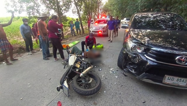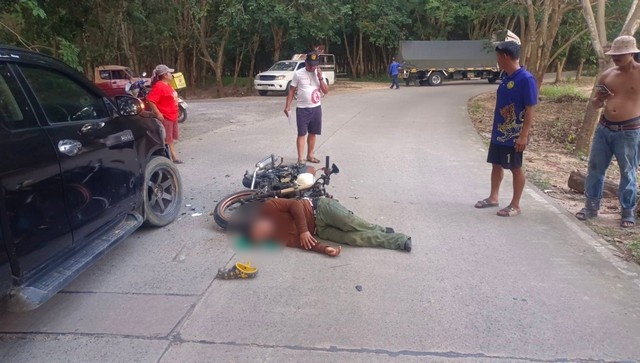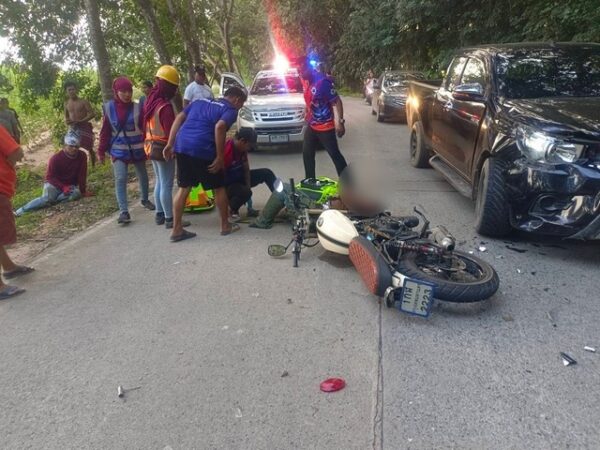 #ชลบุรี จยย. หลุดโค้งเสียหลักพุ่งชนกระบะ เจ็บหนัก