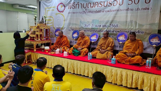 เมื่อวันที่ 21 เมษายน 2568 เวลา 08.00 น. สหภาพแรงงานรัฐวิสาหกิจการไฟฟ้าฝ่ายผลิตแห่งประเทศไทย (สร.กฟผ.) ได้จัดพิธีทำบุญเนื่องในโอกาสครบรอบ 50 ปี แห่งการก่อตั้ง ณ อาคารที่ทำการ สร.กฟผ. จ.นนทบุรี โดยมี น.ส.พนา สุภาวกุล รองผู้ว่าการบริหาร เป็นประธานในพิธี พร้อมด้วยคณะกรรมการบริหาร สมาชิก และผู้บริหาร กฟผ. จากหน่วยงานต่างๆ ร่วมพิธี เพื่อความเป็นสิริมงคลและแสดงถึงความสามัคคี พร้อมรำลึกถึงบทบาทสำคัญของ สร.กฟผ. ตลอดระยะเวลาครึ่งศตวรรษที่ผ่านมา