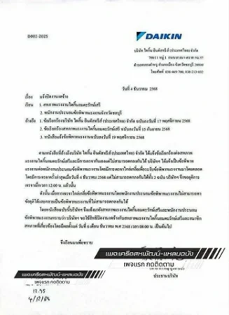 บริษัทฯ ขอใช้สิทธิปิดงานงดจ้างกับสหภาพแรงงานไดกิ้นอมตะรักษ์เสรี และสมาชิกสหภาพที่เกี่ยวข้อง โดยมีผลตั้งแต่วันที่ 6 เดือนธันวาคม พ.ศ 2568 เวลา 08.00 น. เป็นต้นไป