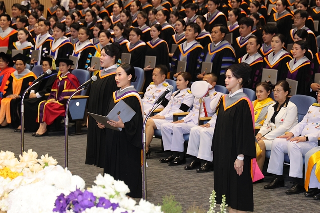 – โอกาสนี้พระราชทานพระราโชวาท ความว่า “การสำเร็จการศึกษาระดับมหาวิทยาลัย นับว่าเป็นจุดเริ่มต้น ที่ควรจะทำให้บุคคลตระหนักถึงความรับผิดชอบ ในฐานะบัณฑิตผู้มีความรู้ความสามารถและคุณธรรม กล่าวคือแต่ละคนพึงนำวิชาความรู้ไปใช้ให้เกิดประโยชน์ต่อสังคมและประเทศชาติ พร้อมทั้งยึดถือคุณธรรมในการดำเนินชีวิตและประกอบกิจการงานอยู่เสมอ การจะทำให้ได้ดังกล่าวนั้น ทุกคนต้องมีใจคิดถึงประโยชน์ส่วนรวม ต้องรู้ว่าการกระทำ คำพูด ความคิด ทุกอย่างของตนย่อมมีผลต่อผู้อื่น สังคม และประเทศชาติ ทั้งโดยทางตรงและทางอ้อม จึงจำเป็นที่ทุกคนจะต้องประพฤติปฏิบัติแต่สิ่งที่ถูกต้องดีงาม ให้บังเกิดผลเป็นประโยชน์ทั้งแก่ตนแก่ส่วนรวม การทำเช่นนี้ แม้บางครั้งจะไม่ใช่เรื่องที่ง่ายหรือสะดวกในเบื้องต้น แต่ย่อมส่งผลดีทั้งแก่บุคคลและสังคมประเทศชาติในระยะยาว ตรงข้ามกับการยึดถือประโยชน์เฉพาะหน้าของตนและพวกพ้อง โดยเบียดเบียนผู้อื่น เบียดบังส่วนรวมให้เสียหาย จึงขอให้บัณฑิตปลูกฝังจิตสำนึกที่ดีงามดังกล่าว ให้เจริญงอกงามขึ้นในตน จะได้สามารถดำรงตนอยู่ในสังคมได้อย่างผาสุก และร่วมกันพัฒนาชาติบ้านเมืองให้รุ่งเรืองก้าวหน้าได้อย่างยั่งยืน”