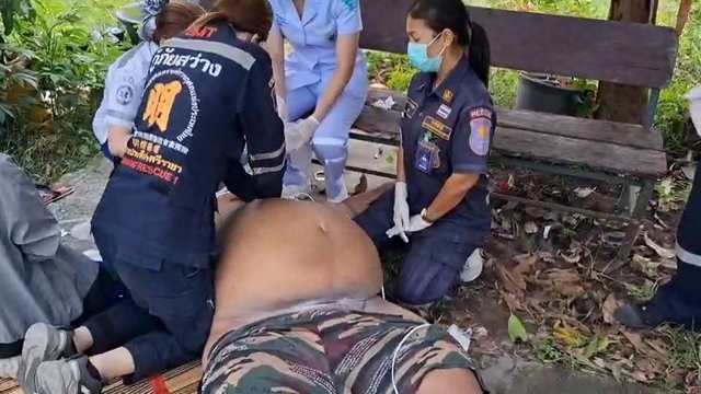 ในที่เกิดเหตุพบ ผู้ป่วยนอนหมดสติทราบชื่อต่อมาคือนายธีรภัทร อายุ 35 ปี น้ำหนัก 200 กิโล นอนหมดสติอยู่บริเวณโต๊ะ หน้าบ้าน โดยเจ้าหน้าที่ทำงานปฐมพยาบาลเบื้องต้น ก่อนทำการ CPR ผู้ป่วย หลังจากนั้นเจ้าหน้าที่หน่วยกู้ภัย พยายามนำตัวผู้ป่วยส่งโรงพยาบาลแต่ผู้ป่วย รูปร่างลักษณะอ้วนใหญ่ไม่สามารถนำขึ้นรถพยาบาลได้จึงประสานไปยังรถสไลด์ เพื่อนำผู้ป่วยส่งโรงพยาบาลอย่างเร่งด่วน โดยเจ้าหน้าที่ทำการนำผู้ป่วยขึ้นรถสไลด์ และนำส่งโรงพยาบาล วิภาราม แหลมฉบัง