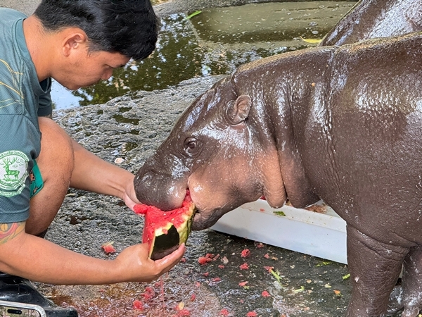ขณะเดียวกัน “หมูเด้ง” ฮิปโปโปเตมัสแคระขวัญใจนักท่องเที่ยว ก็ได้อิ่มอร่อยกับเมนูแตงโมหวานฉ่ำสีแดงสด ที่เจ้าหน้าที่จัดเตรียมมาเป็นพิเศษ เพื่อช่วยคลายร้อนและเติมความสดชื่น โดยหมูเด้งแสดงพฤติกรรมกินอย่างเอร็ดอร่อย สร้างความน่ารักและรอยยิ้มให้กับนักท่องเที่ยวที่เข้าชมเป็นอย่างมาก