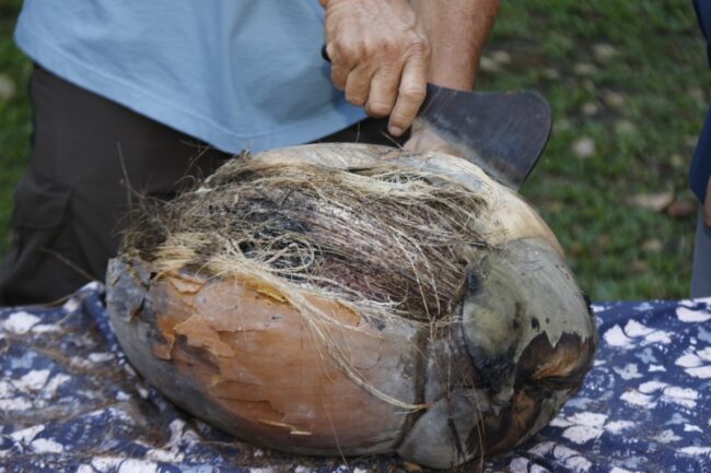 โดย นายกัมพล ตันสัจจา ประธานสวนนงนุชพัทยา ได้พาชมมะพร้าวทะเลซึ่งสุกพร้อมกันจำนวน 3 ลูก โดย พร้อมทำการปลอกมะพร้าวทะเลสุก เพิ่มอีก 3 ลูกพร้อมกัน โดยต้นมะพร้าวทะเล ต้นที่สุกในวันนี้เป็นต้นที่ 4 มีอายุประมาณ 32 ปี เคยสุกในต้นเดียวกันมาแล้ว จำนวน 3 ลูกพร้อมกัน ต้นนี้ได้นำมาปลูก เมื่อวันที่ 5 มีนาคม 2542 ( ต้นกล้าอายุประมาณ 9 ปี ) มะพร้าวทะเล ต้นนี้ความแข็งแรงสมบูรณ์ ผลดก และมี ผลขนาดใหญ่มาก ทั้งต้น มีผลทั้งหมด 28 ผล เก็บไปแล้ว3ผล และเก็บในวันนี้อีก 3ผล พร้อมเตรียมนำไปขยายพันธุ์