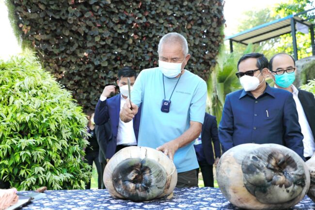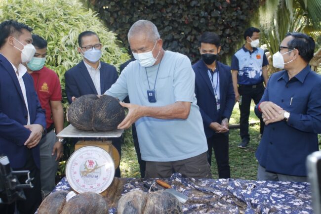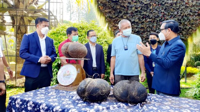 ชลบุรี# สวนนงนุชพัทยาโชว์ มะพร้าวทะเลสุกพร้อมกัน 3 ลูก หนักกว่า 10 กิโล โดยมีท่านทูตกัมพูชา เป็นเกียรติร่วมชม พร้อมเตรียมนำไปขยายพันธุ์