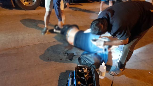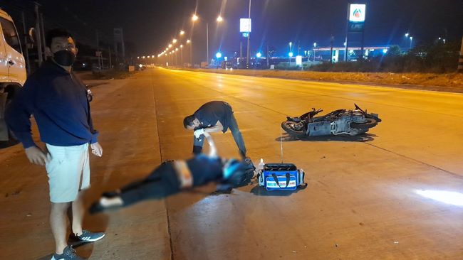 ซึ่งผู้บาดเจ็บรู้สึกตัวดีแต่ถามตอบไม่ค่อยรู้เรื่องเนื่องจากมีอาการเบลอ ซึ่งผู้เห็นเหตุการณ์ที่ขับรถตามมาบอกว่ารถพ่วง22ล้อยี่ห้อฮีโน่ หัวสีขาว ทะเบียนส่วนหัว 70-4099 มหาสารคาม ส่วนพ่วง72-3410 สระบุรี บรรทุกน้ำมันเชื้อเพลิง ของบริษัทNAKA PETROLEUM NONGKHAI CO.LTD จอดอยู่ริมถนนสายมาบเอียง-แหลมฉบังใกล้กับปั๊มน้ำมันปตท.รถจยย.ของผู้บาดเจ็บที่ขี่มาก็ได้พุ่งชนท้ายรถช่วงป้ายทะเบียนที่เป็นเหล็กจนยุบลงไปจนทั้งคนและรถกระเด็นลอยไปอยู่ที่กลางถนนจนได้รับบาดเจ็บสาหัสดังกล่าว ส่วนคนขับรถก็ไม่ได้อยู่ในรถบรรทุกน้ำมันเชื้อเพลิงแต่อย่างไร มีแต่รถจอดทิ้งไว้ ตัวออกไปไหนไม่รู้ส่วนรถจยย.ของผู้บาดเจ็บที่ขี่มายี่ห้อฮอนด้าคลิกสีดำ-แดงหมายเลขทะเบียน3กฏ-3561ชลบุรีสภาพด้านหน้ารถพังยับเยิน หลังจากทีมแพทย์พยาบาลเดินทางมาถึงก็รีบนำตัวผู้บาดเจ็บสาหัสส่งรักษาที่โรงพยาบาลสมเด็จพระบรมราชเทวี ณศรีราชาต่อไป ส่วนเจ้าหน้าที่ตำรวจจะได้ติดตามคนขับรถพ่วง22ล้อบรรทุกน้ำมันเชื้อเพลิงมาสอบสวนต่อไป