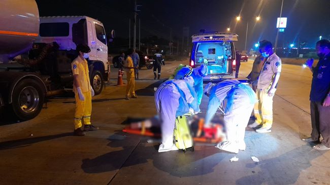หนุ่มวัย31ปีซิ่งจยย.ชนท้ายรถพ่วง22ล้อบรรทุกน้ำมันเชื้อเพลิงที่จอดอยู่ริมถนนหวิดตายคาที่