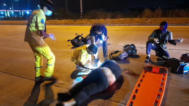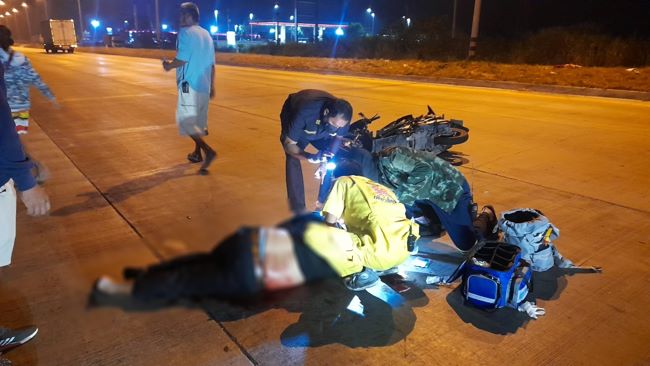 เมื่อเวลา02.00น.วันที่18ม.ค.2565 พ.ต.ท.นพดล วันดี สว.เวรสอบสวนสภ.หนองขามได้รับแจ้ง ว่ามีคนขี่รถจยย.ชนท้ายรถพ่วง22ล้อได้รับบาดเจ็บสาหัสที่ริมถนนสายมาบเอียง-แหลมฉบังใกล้กับปั๊มน้ำมันปตท.เขาชีปิ่นทอง หมู่4ต.หนองขามอ.ศรีราชาหลังรับแจ้งจึงประสานอาสาหน่วยบรรเทาสาธารณภัยพุทธสมาคมเพียวเยี้ยงไท้ศรีราชาออกตรวจสอบ เมื่ออาสาเดินทางไปตรวจสอบก็พบร่างของนายบรรฑิต ฉริตรัมย์ อายุ31ปีนอนจมกองเลือดอยู่บนถนนโดยมีบาดแผลลึกที่ศีรษะเป็นแนวยาวเนื่องจากศีรษะกระแทกกับช่วงเหล็กป้ายทะเบียนท้ายรถพ่วง22ล้ออย่างแรงทางอาสาหน่วยบรรเทาสาธารณภัยพุทธสมาคมเพียวเยี้ยงไท้ศรีราชา จึงช่วยกันปฐมพยาบาลเพื่อรอรถพยาบาลฉุกเฉินจากโรงพยาบาลสมเด็จพระบรมราชเทวี ณ ศรีราชา พร้อมทีมแพทย์พยาบาลมารับตัวผู้บาดเจ็บสาหัสที่เสียเลือดมาก