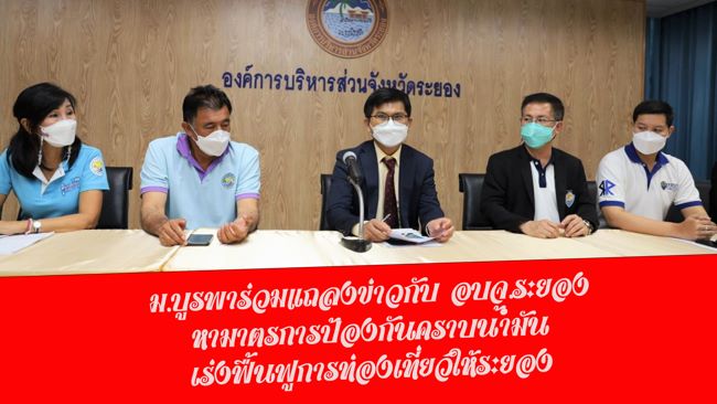 เมื่อวันที่ 2 กุมภาพันธ์ รศ.ดร.วัชรินทร์ กาสลัก อธิการบดีมหาวิทยาลัยบูรพา และ นายปิยะ ปิตุเตชะ นายกองค์การบริหารส่วนจังหวัดระยอง พร้อมด้วยคณะทำงานจากทั้งสองหน่วยงานได้ร่วมแถลงข่าว การติดตามผลกระทบของน้ำมันรั่วไหลต่อทรัพยากรทางทะเลและชายฝั่งและเศรษฐกิจและสังคม สืบเนื่องจากสถานการณ์น้ำมันรั่วไหลจากท่อส่งน้ำมันที่เกิดขึ้น เมื่อวันที่ 25 มกราคม 2565 และน้ำมันดังกล่าวได้แพร่กระจายเข้าสู่พื้นที่ชายหาด บริเวณหาดแม่รำพึง จังหวัดระยองนั้น ทางองค์การบริหารส่วนจังหวัดระยอง ได้คำนึงความจำเป็นเร่งด่วนในการดูแลทรัพยากรและความเป็นอยู่ของประชาชน จึงได้วางแผนติดตามผลกระทบกรณีน้ำมันรั่วไหล ที่จะเกิดขึ้นกับสิ่งแวดล้อม และส่งผลกระทบต่อเศรษฐกิจและสังคมของจังหวัดระยอง โดยร่วมมือกับมหาวิทยาลัยบูรพา ทั้งนี้มหาวิทยาลัยบูรพาโดยได้ส่งคณาจารย์ นักวิจัย ลงพื้นที่สำรวจพบคราบน้ำมันลอยบริเวณผิวน้ำทะเล ในวันที่ 29-30 มกราคม 2565 โดยเก็บข้อมูลสิ่งแวดล้อมบริเวณชายฝั่ง พบว่าน้ำมันส่วนหนึ่งถูกกระแสน้ำพัดขึ้นมาเกยอยู่บริเวณชายหาด ซึ่งส่งผลให้เกิดความกังวลเกี่ยวกับผลกระทบทางสิ่งแวดล้อม เศรษฐกิจ และสังคม ในพื้นที่ที่ได้รับผลกระทบจากเหตุการณ์ดังกล่าว
