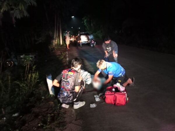 ที่เกิดเหตุพบร่างนาย เฉลิมพันธ์ อุดมพงษ์ อายุ 41 ปี ได้รับบาดเจ็บที่ศีรษะ มีเลือดไหลนอง เจ้าหน้าที่กู้ภัยฯปฐมพยาบาลเบื้องต้น ก่อนเคลื่อนย้ายส่งโรงพยาบาลอย่างเร่งด่วน บริเวณริมป่ายังพบรถจยย.ดัดแปลงต่อพ่วง จอดอยู่ ไม่รับความเสียหายมากนัก