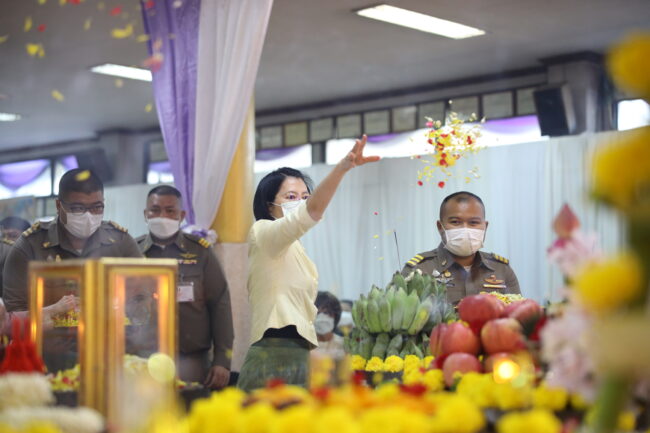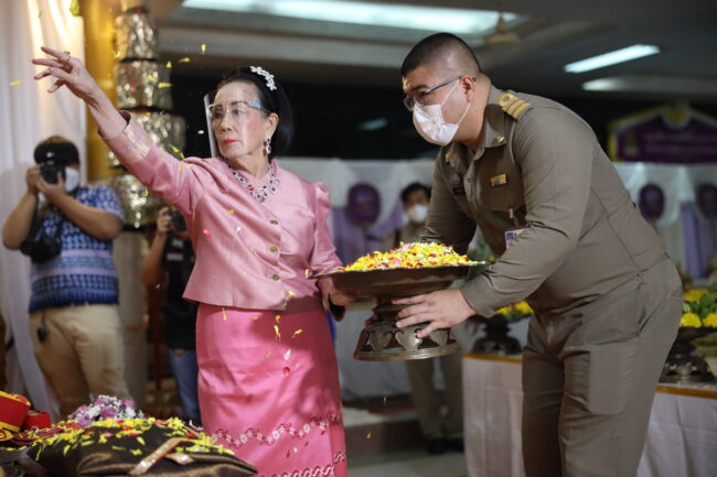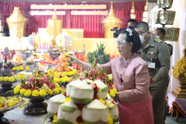 เมื่อวันที่ 24 กุมภาพันธ์ 2565 เวลา 08.00 น. ที่อ่างวัดอ่างศิลา อำเภอเมืองชลบุรี จังหวัดชลบุรี นางสาวฐิติลักษณ์ คําพา รองผู้ว่าราชการจังหวัดชลบุรี พร้อมด้วย ดร.ฉวีวรรณ คำพา นายกสมาคมส่งเสริมการเลี้ยงไก่แห่งประเทศไทยในพระบรมราชูปถัมภ์ และประธานกรรมการบริหาร บริษัทในเครือฉวีวรรณ กรุ๊ป ร่วมกันเป็นประธานฝ่ายฆราวาส ในพิธีบวงสรวงเครื่องสูงและเครื่องประกอบเกียรติยศประกอบศพ ได้รับพระราชทาน โดยร่วมกันจุดธูปเทียนบอกกล่าวสิ่งศักดิ์สิทธิ์ ปักธูปบูชา เครื่องบวงสรวง พราหมณ์ประกอบพิธีบวงสรวงบอกกล่าวและบูชาเทพยดา อัญเชิญเทวดา และอ่านโองการเครื่องบวงสรวงสังเวย จากนั้นประธานในพิธีร่วมโปรยข้าวตอก ดอกไม้ หน้าเครื่องบวงสรวง