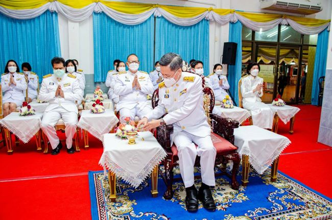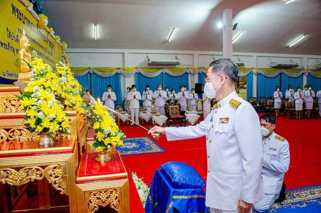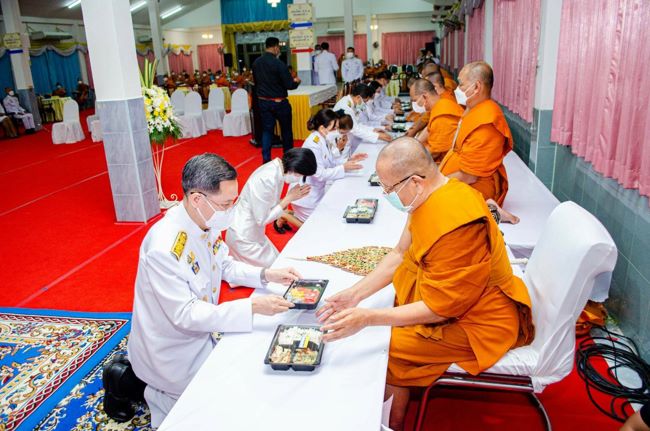 พร้อมด้วยหัวหน้าส่วนราชการ ข้าราชการ และประชาชน เข้าร่วมพิธีฯ นายอำพล อังคภากรณ์กุล ผู้ว่าราชการจังหวัดนครนายก ประธานในพิธีได้จุดธูปเทียนเครื่องนมัสการบูชาพระรัตนตรัย เปิดกรวยกระทงดอกไม้ธูปเทียนแพเบื้องหน้าพระบรมฉายาลักษณ์พระบาทสมเด็จพระเจ้าอยู่หัว รับศีล ประธานในพิธีกล่าวคำถวายภัตตาหาร ต่อจากนั้นประธานในพิธีฯ ถวายภัตตาหารและสิ่งของพระราชทานแด่ประธานสงฆ์ และข้าราชการ ประชาชน ร่วมถวายภัตตาหารและสิ่งของพระราชทาน แด่พระภิกษุ สามเณร ที่เหลือจนครบ ประธานสงฆ์อนุโมทนา ถวายอดิเรก ประธานในพิธีกราบหน้าเครื่องนมัสการพระรัตนตรัย ทำความเคารพหน้าพระบรมฉายาลักษณ์ พระบาทสมเด็จพระเจ้าอยู่หัว กราบประธานสงฆ์ ถ่ายรูปหมู่พร้อมกัน เป็นอันเสร็จพิธีฯ