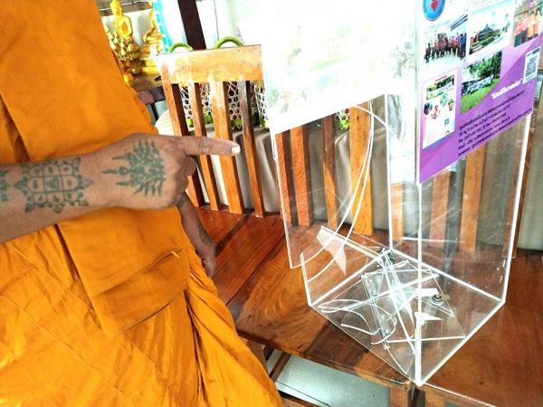 จากการให้สัมภาษ์ของพระครูโสภณนาคกิจ เจ้าคณะอำเภอบ้านนา เจ้าอาวาสวัดช้าง ได้เล่าว่าเมื่อไม่นานมานี้ทางศูนย์ส่งเสริมและพัฒนาอาชีพคนตาบอดพิการซ้ำซ้อนนครนายก ได้นำตู้บริจาคปันรักให้คนตาบอดพิการซ้ำซ้อน ได้มาฝากว่างไว้ที่หน้ากุฏิ และได้มีญาติโยมได้มาทบุยที่วัดช้างและได้นำปัจจัยหยอดลงในตู้มียอดเงินทั้งหมดประมาณ 8000 บาท ต่อมาได้มีชาวบ้านไปพบตู้รับบริจาคถูกทุบแตกตกอยู่ข้างซุ้มประตูวัด จึงได้เก็บนำมาให้ที่วัดช้าง ส่วนเรื่องการแจ้งความก็จะให้คณะกรรมการของวัดเข้าแจ้งความที่สถานีตำรวจภูธรอำเภอบ้านนาต่อไป